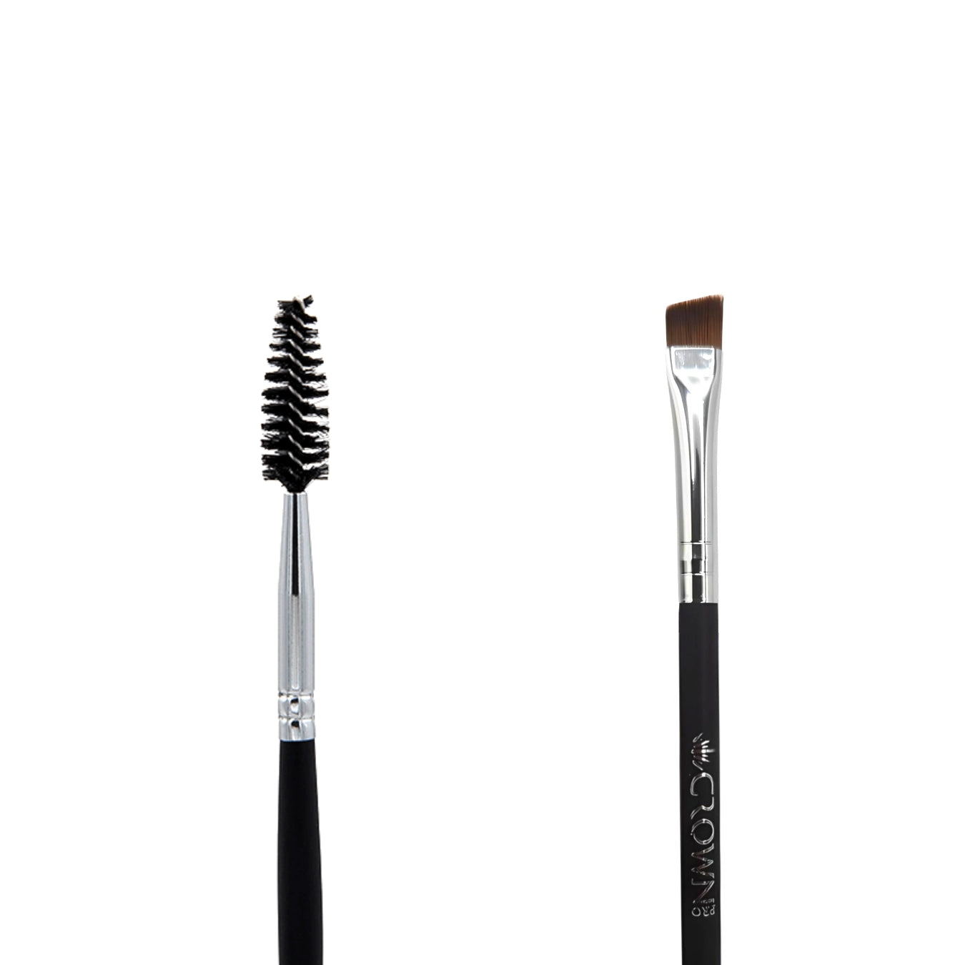 This dual-ended brow brush features an angled cut brush for precision application with cream or powder products and a spoolie brush for blending and shaping. Made with synthetic fibers.